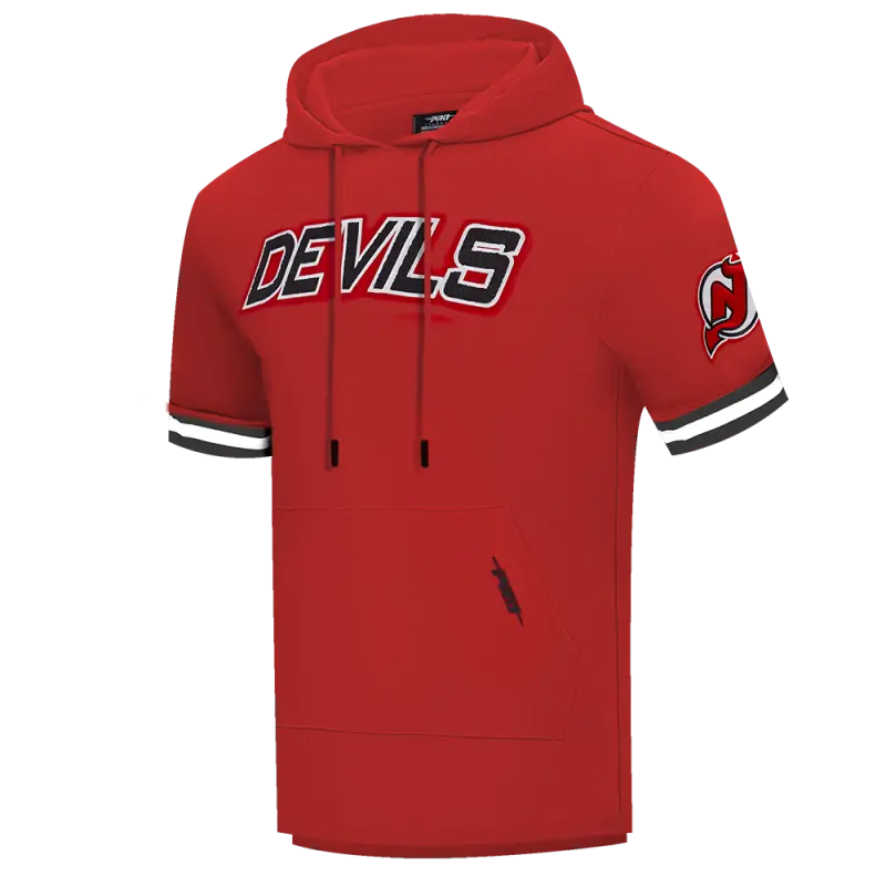 NHL NEW JERSEY DEVILS CLASSIC CHENILLE MEN’S DOUBLE KNIT SHORT SLEEVE PULLOVER HOODIE (RED\/BLACK)