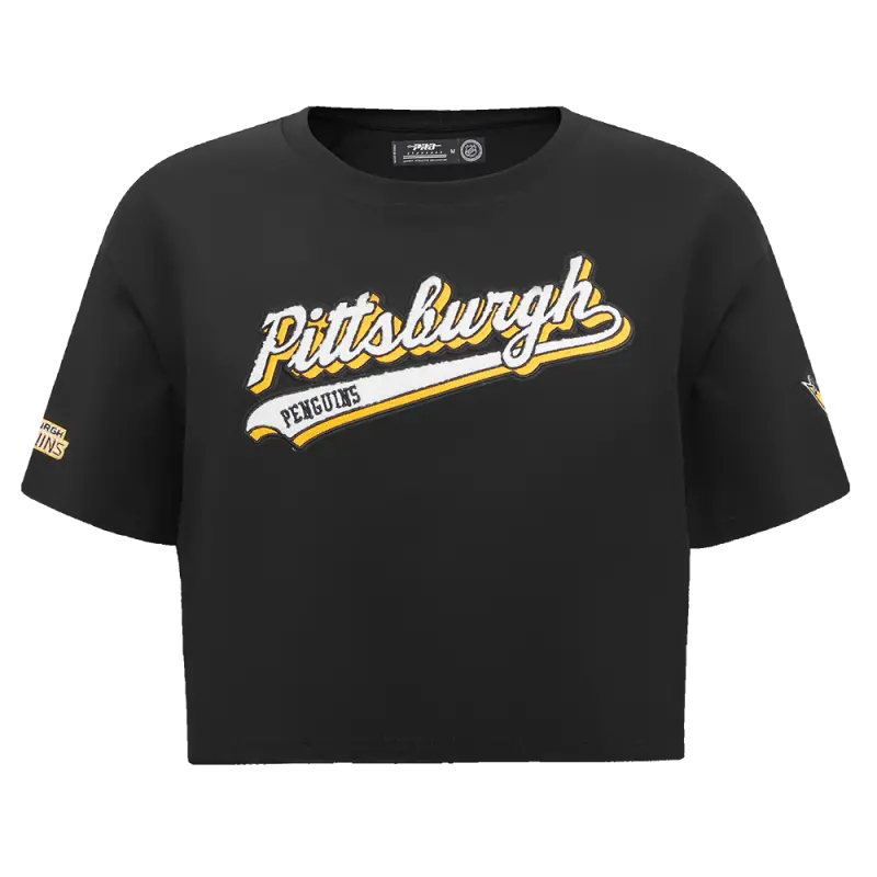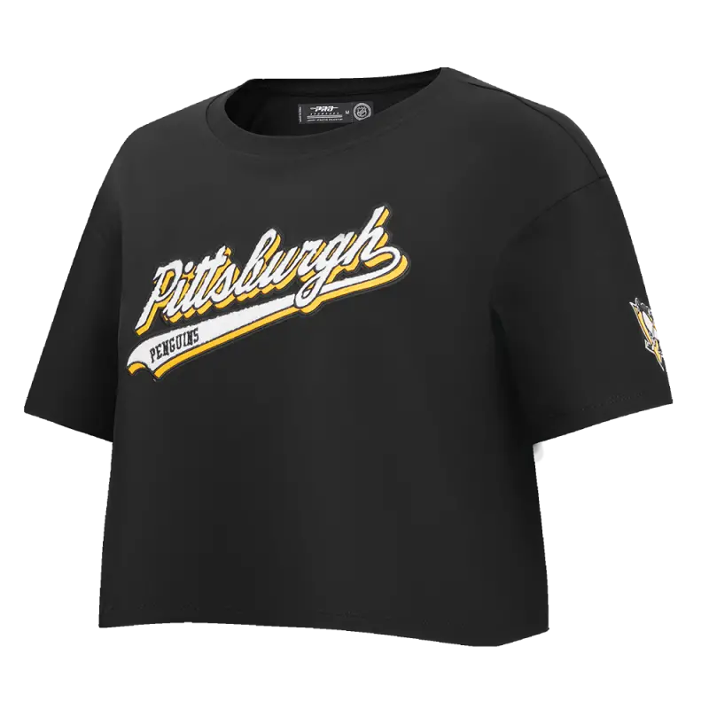 NHL PITTSBURGH PENGUINS SCRIPT TAIL WOMEN’S SINGLE JERSEY BOXY TEE (BLACK)