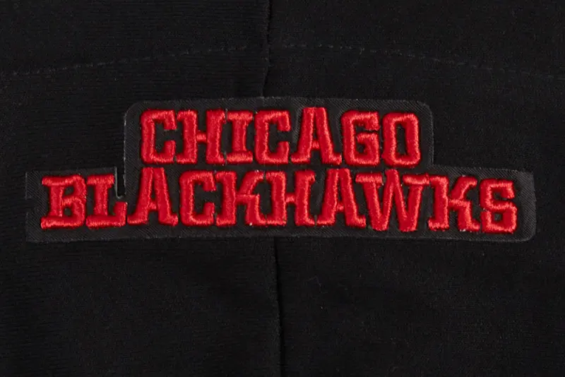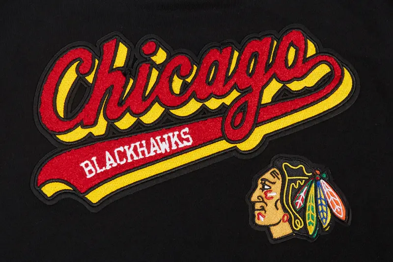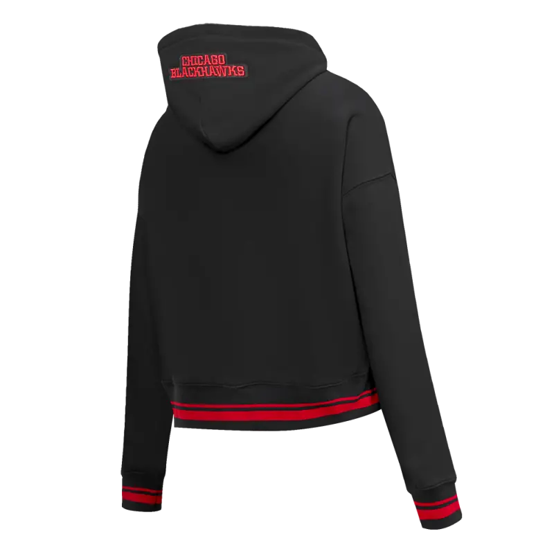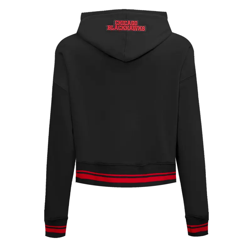 NHL CHICAGO BLACKHAWKS SCRIPT TAIL WOMEN’S RIB FLEECE CROPPED PULLOVER HOODIE (BLACK\/RED\/BLACK)