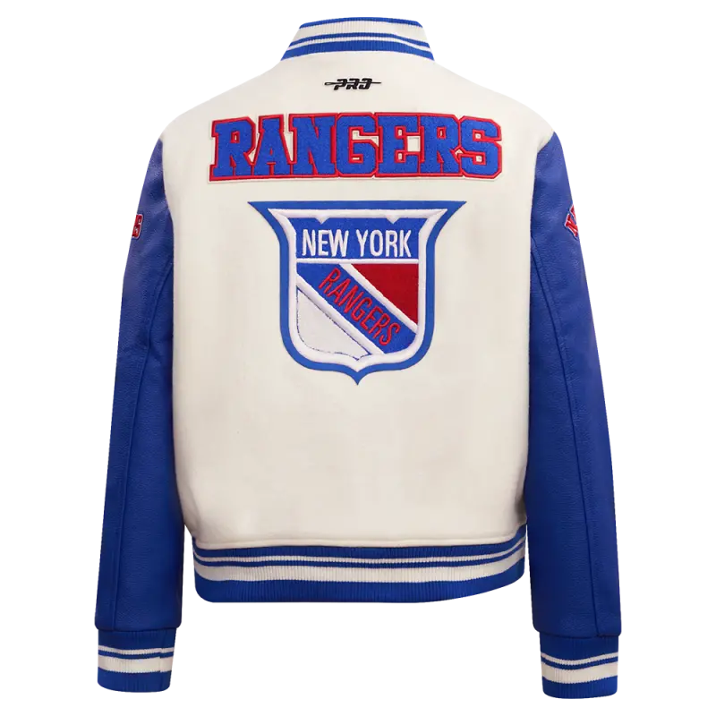 NHL NEW YORK RANGERS RETRO CLASSIC WOMEN’S RIB WOOL VARSITY JACKET (EGGSHELL\/ROYAL BLUE)