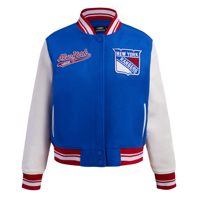 NHL NEW YORK RANGERS SCRIPT TAIL WOMEN’S WOOL VARSITY JACKET (ROYAL BLUE\/RED)